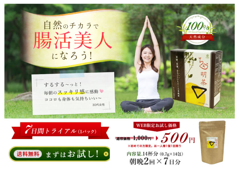 「ちょう明茶」は100%天然成分のみ(下剤成分ゼロ)なので、人が本来持っている自然のチカラを取り戻し「内側からスッキリを促す」カラダに優しいお茶です。
